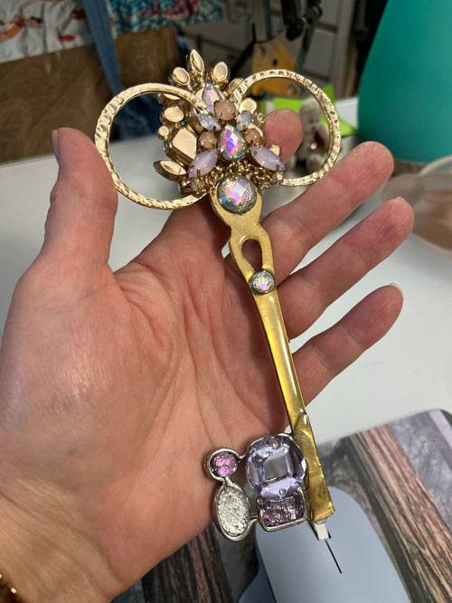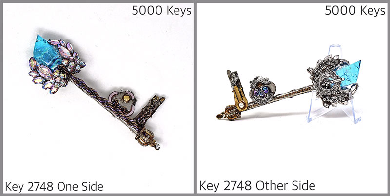 I recently finished Key 2748—it’s made from a pair of my grandmother’s earrings, part of a bracelet from a dear friend, a favourite pendant, and some great thrift store finds. I almost gave up on the other side of Key 2748 as I was feeling out of creative juice—but I kept working on it and I am overjoyed with the results. (It’s) a very magical looking key, even more special because I persevered. Like most of the keys I’m particularly fond of, I can’t quite believe the making of it flowed through me.